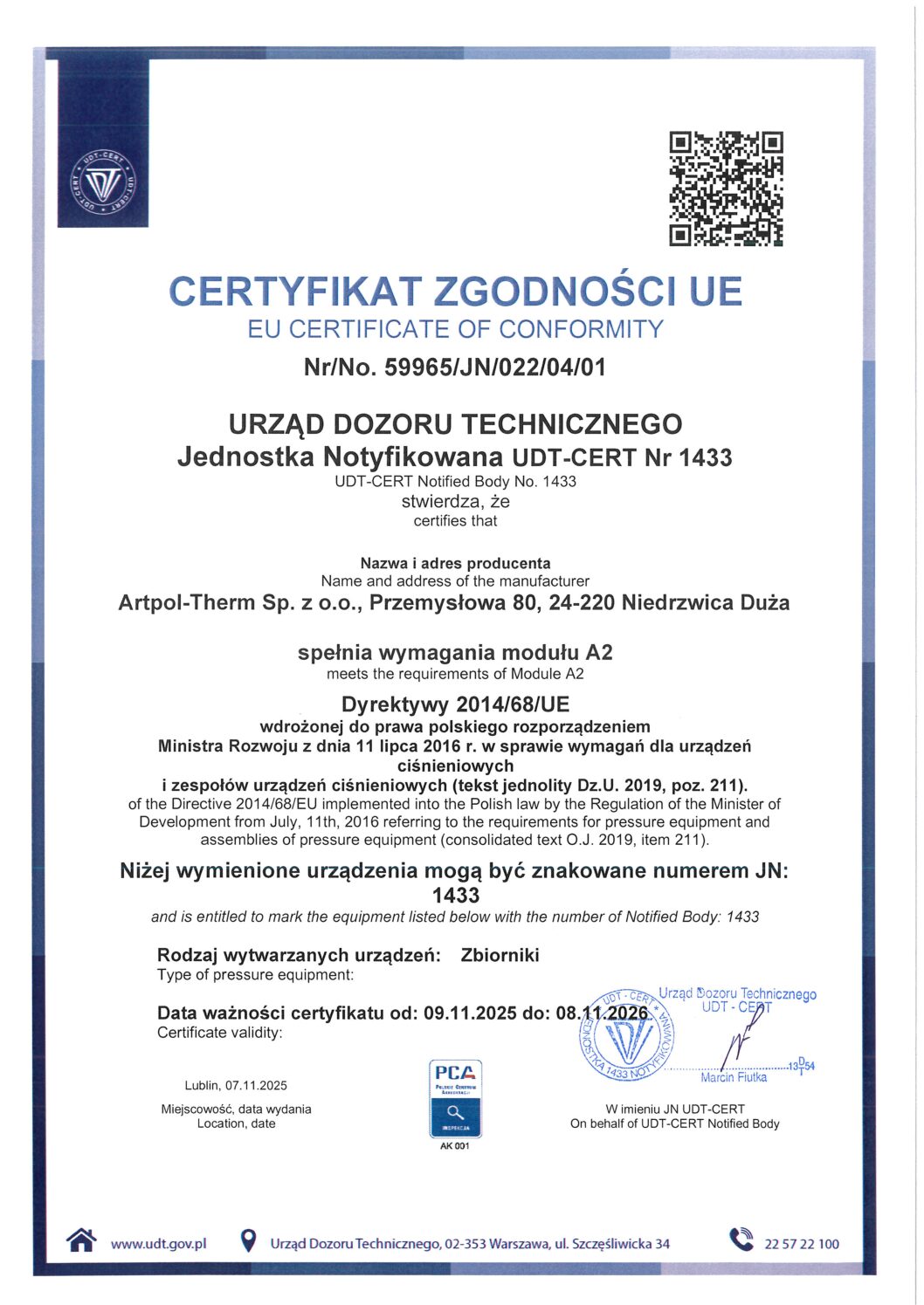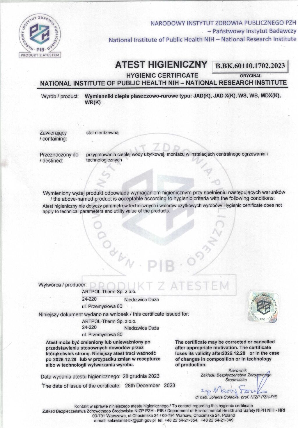 O wysokiej jakości naszych wyrobów świadczą liczne atesty i certyfikaty. Są one zgodne z wymogami Urzędu Dozoru Technicznego, Państwowego Zakładu Higieny. Produkty dostarczamy do odbiorców na terenie całej Polski, ale nie tylko. Zostaliśmy docenieni także za granicą: realizujemy zamówienia dla przedsiębiorstw energetyki cieplnej, producentów węzłów ciepłowniczych oraz klientów indywidualnych m.in. z Ukrainy, Litwy, Słowacji i Czech.